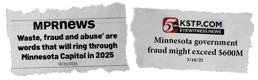 At Fight the Fraud, we’re taking on the broken status quo and standing with leaders who will put an end to wasteful government spending. From the failed policies coming out of St. Paul to the out-of-touch bureaucrats, taxpayers are being robbed to fund bloated programs, political pet projects, and reckless mismanagement.